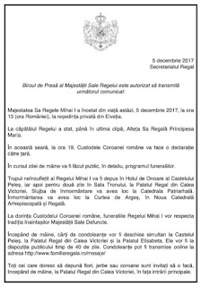 „Majestatea sa Mihai I a incetat din viata azi, 5 decembrie 2017, la ora 13 (ora Romaniei), la resedinta privata din Elvetia.